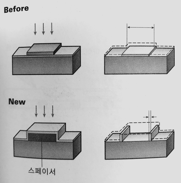일반적인 식각 공정에서는 마스크를 씌운 후에 식각을 진행하여 회로를 만든다. 아래쪽 그림은 마스크와 같은 재질의 물질을 스페이스로 먼저 적층한 후 회로로 사용할 물질을 도포한다. 그런 후 스페이스를 제거함과 동시에 이미 도포한 물질의 세로 부분만 사용한다. |