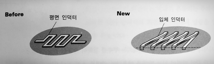 집적회로에 사용되는 인덕턴스 코일은 표면에서 구부러지는 직각이나 뱀의 모양을 하고 있다. 수평으로 구부러지는 모양에 수직으로도 구부러지는 형태를 첨가하여 인덕턴스 용량이 증가하거나 더 작은 표면적의 인덕턴스를 만들 수 있다. |