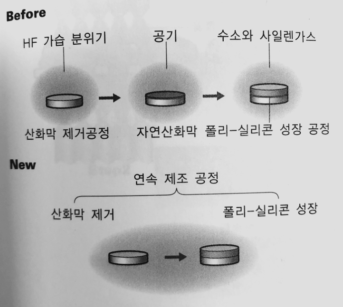 실리콘 웨이퍼 위에 폴리-실리콘을 적층할 때, 웨이퍼 위의 산화막을 제거한 후 곧 바로 폴리-실리콘 적층 공정을 위해 이동을 하더라도 웨이퍼 상단은 순식간에 산화되어 버린다. 이 산화막은 웨이퍼의 전기적 특성을 급격히 저하시킨다. 낮은 압력에서 HF가스를 이용하여 산화막을 제거하고 곧 바로 폴리-실리콘 적응을 위한 가스와 함께 동시에 압력을 올려 한번의 공정으로 산화막 없는 폴리-실리콘을 적층한다. |