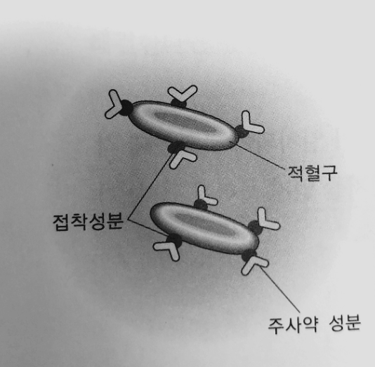 환자의 치료에 필요한 성분을 일주일 이상 지속적으로 투여하여야 하는 경우 장시간 지속을 위하여 다량을 투여하면 환자의 건강이 위험해지고 계속 주사를 통해 공급하는 것은 환자의 불편이 큰 모순에 부딪힌다. 그림과 같이 혈액 속의 적혈구에만 선택적으로 부착되는 물질과 함께 치료성분을 결합하여 주사한다. 그러면 치료성분은 적혈구에 접착하게 되고 접착성분은 시간이 지나면서 하나 둘씩 기능을 상실하여 적혈구로부터 분리 된다. 이때에 치료성분이 약효를 발휘하기 시작한다. 모든 접착성분이 기능을 상실하려면 1 ~ 2주가 필요하므로 장기간 약효가 발휘된다. 적혈구가 중간자 역할을 하는 것이다. |