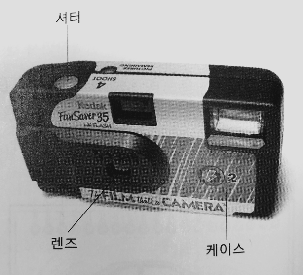 일회용 사진기는 필름이 안에 포함되어 있다. 휴양지 등에 가서 일회용으로 사용할 수 있다. 1800년대 말에 처음으로 사진기가 나왔을 때에도 그림과 같은 일체형 카메라였는데 100년이 지나 동일한 형태의 카메라가 다른 목적으로 등장하였다. |