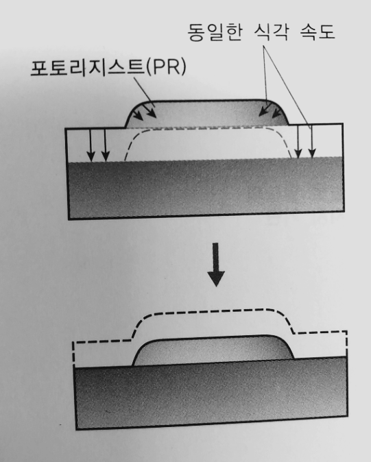 모서리 부분이 완만한 경사(Sloped sidewalls)를 가지는 구조물을 만들기 위해 기판위의 구조물과 식각 속도가 동일한 보호막(photo resist)를 사용한다. 보호막이 원하는 경사를 가지게 만든다. 플라즈마 에칭공정에서 보호막 아래부분의 구조물은 동일한 식각속도로 인하여 보호막과 동일한 구조의 완만한 경사를 가지게 된다. |
